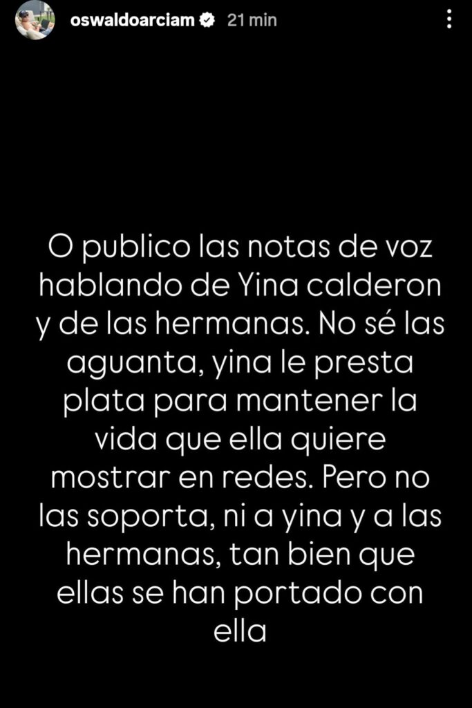 Uno de los mensajes publicados por Oswaldo llamó la atención de los seguidores en donde él mencionó a Yina Calderón: