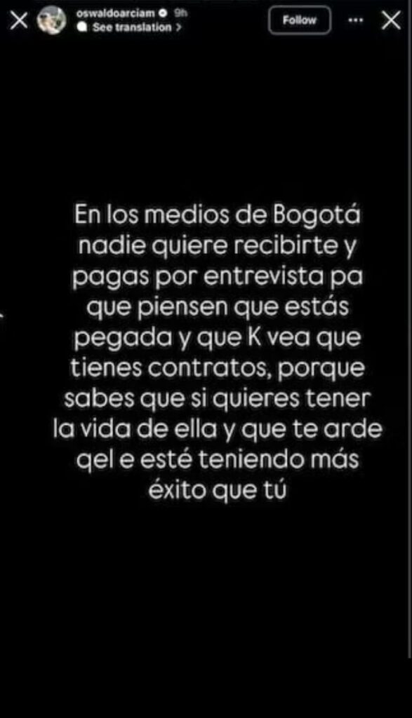 “En los medios de Bogotá nadie quiere recibirte y pagas por entrevista pa’ que piensen que estás pegada y que K (Karina García) vea que tienes contratos, porque sabes que si quieres tener la vida de ella y que te arde que esté teniendo más éxito que tu”, añadió.