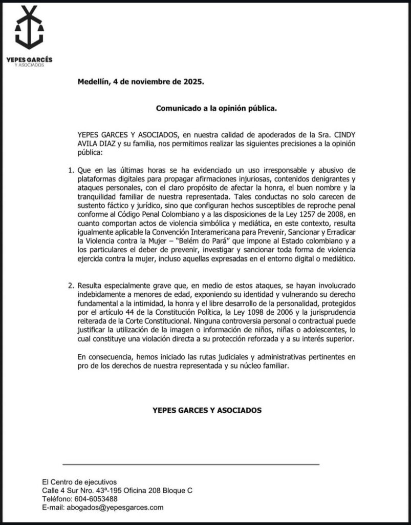 El equipo jurídico de La Toxicosteña, representado por el bufete Yepes Garcés & Asociados, anunció que emprenderán acciones legales por injuria y calumnia, además de denunciar la exposición de menores de edad en medio del conflicto.