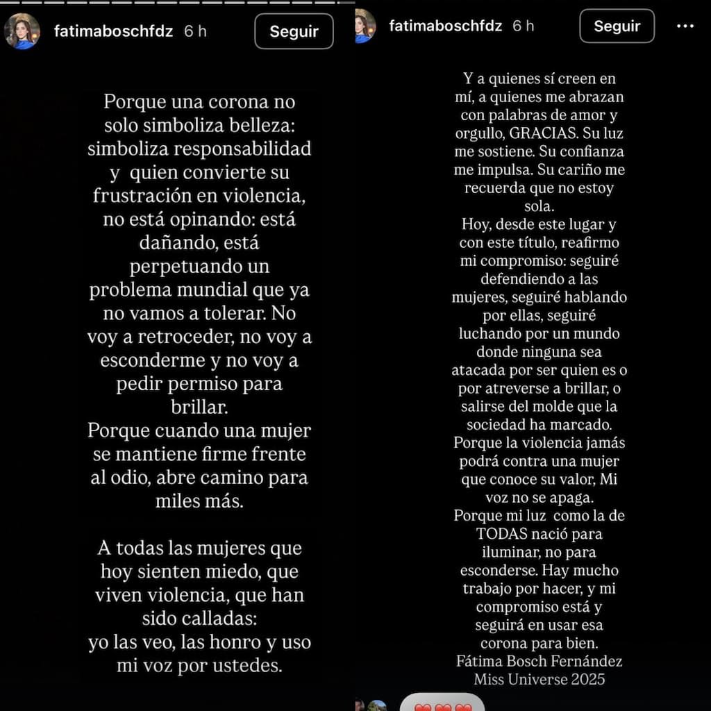 A través de sus redes sociales, Fátima compartió su sentir luego de días de señalamientos que cuestionaban su triunfo. La joven aseguró que ha recibido insultos, calumnias y hasta amenazas, pero que no permitirá que la violencia digital opaque su trabajo, ni su compromiso como representante de México ante el mundo.